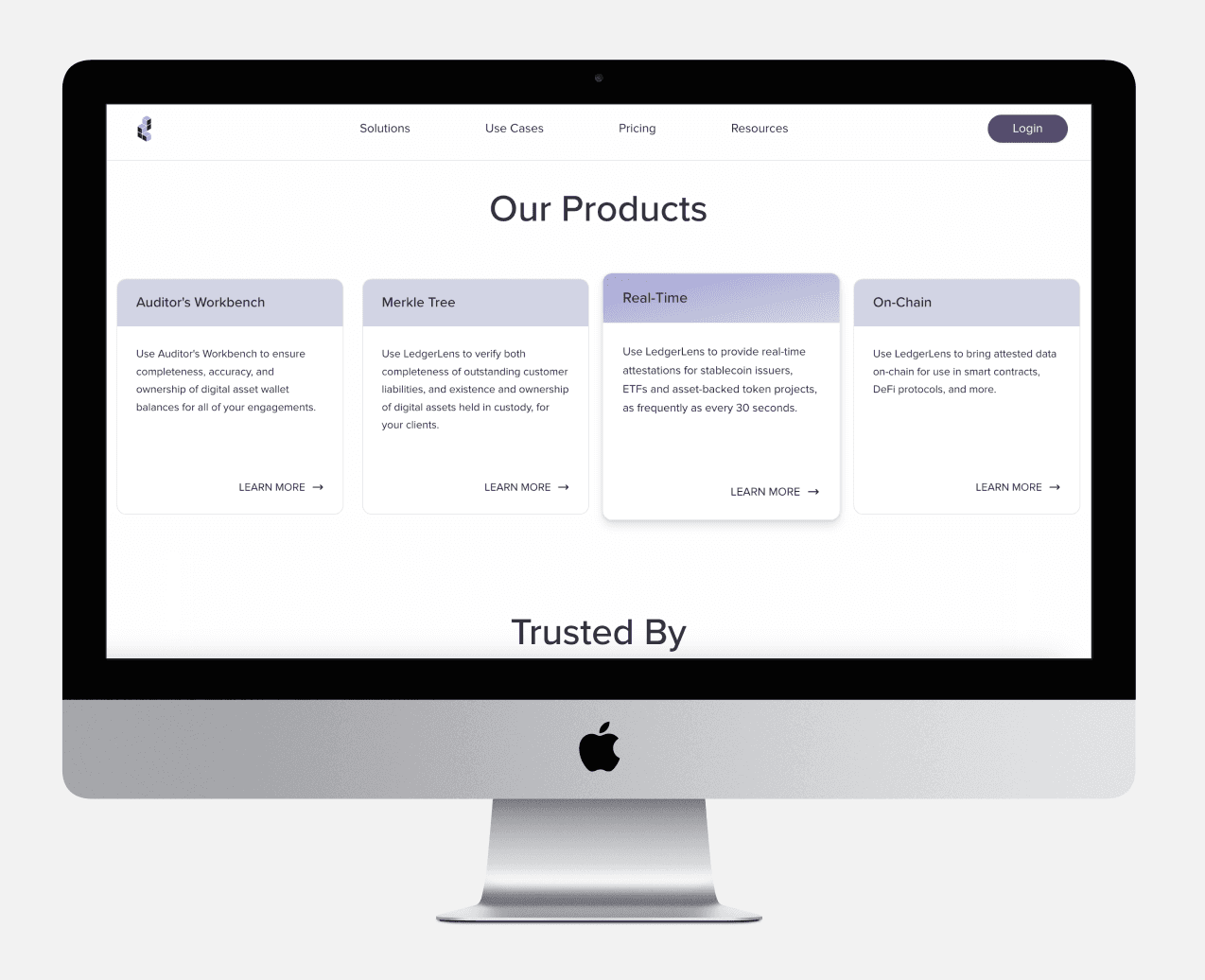 The transition into a clean and predictable designed allows for easy navigation and exploration of what LedgerLens has to offer their company.