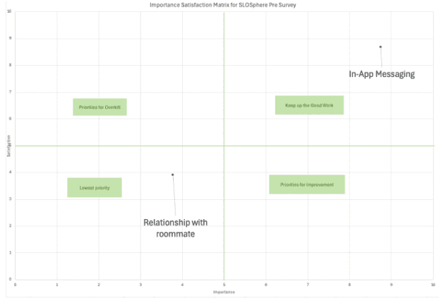 Research & Analysis: We began by sending out our survey to Cal Poly students, in order to understand the current state. In Doing so, we gathered 86 responses in one week. Kano model questions helped us gather data for our priority graph. We found that relationship with roommate was low in priority, and we wanted to bring that into the keep up the good work zone.
